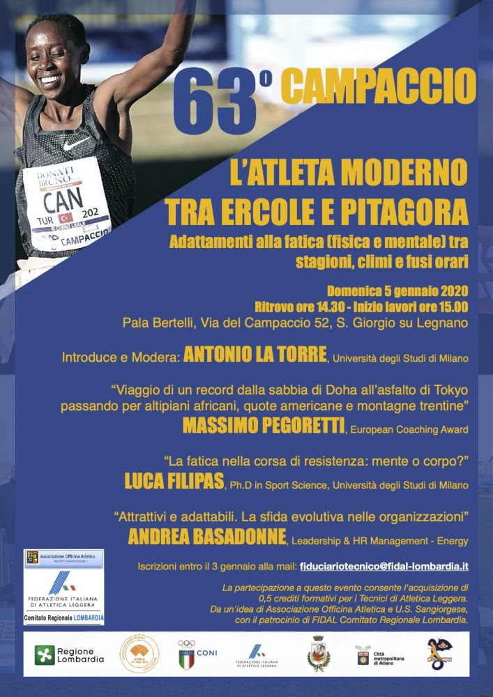 Prima di correre il Cross del Campaccio di lunedì 6 gennio 2020, spazio all'aggiornamento degli allenatori di fondo e mezzofondo. Piccola tradizione consolidata, quest'anno l'appuntamento dedicato ai tecnici (domenica 5 gennaio 2020) prevede un convegno (patrocinato dal Comitato Regionale FIDAL Lombardia e organizzato in collaborazione con Officina Atletica e con l’US Sangiorgese) dal titolo “L’Atleta Moderno tra Ercole e Pitagora”.