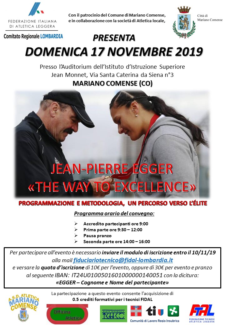 Segnaliamo un importante convegno a cura dell'associazione Officina Atletica. Domenica 17 novembre a Mariano Comense (Co) sarà ospite il celebre allenatore svizzero Jean-Pierre Egger, coach specializzato nei lanci, tecnico dell'ex campione mondiale di lancio del peso Werner Gunthor e della campionessa olimpica Valerie Adams.