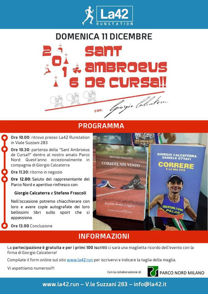 Nel vasto panorama delle corse su strada, merita una particolare segnalazione la prossima edizione della Sant Ambroeus de Cursa, organizzata per domenica 11 dicembre da "La 42 runstation" nel Parco Nord di Milano (viale Suzzani 283).